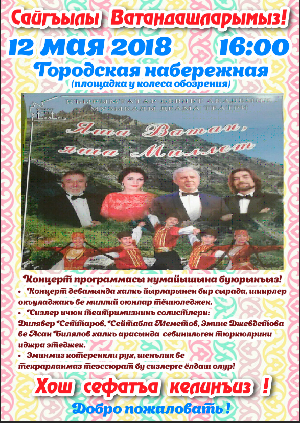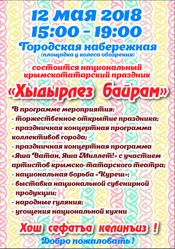 В Керчи 12 мая с 15.00 до 19.00 на городской набережной (у колеса обозрения) пройдут праздничные мероприятия, посвященные крымскотатарскому празднику «Хыдырлез Байрам». Об этом сообщает пресс-служба администрации Керчи, - передает Керчь.ФМ