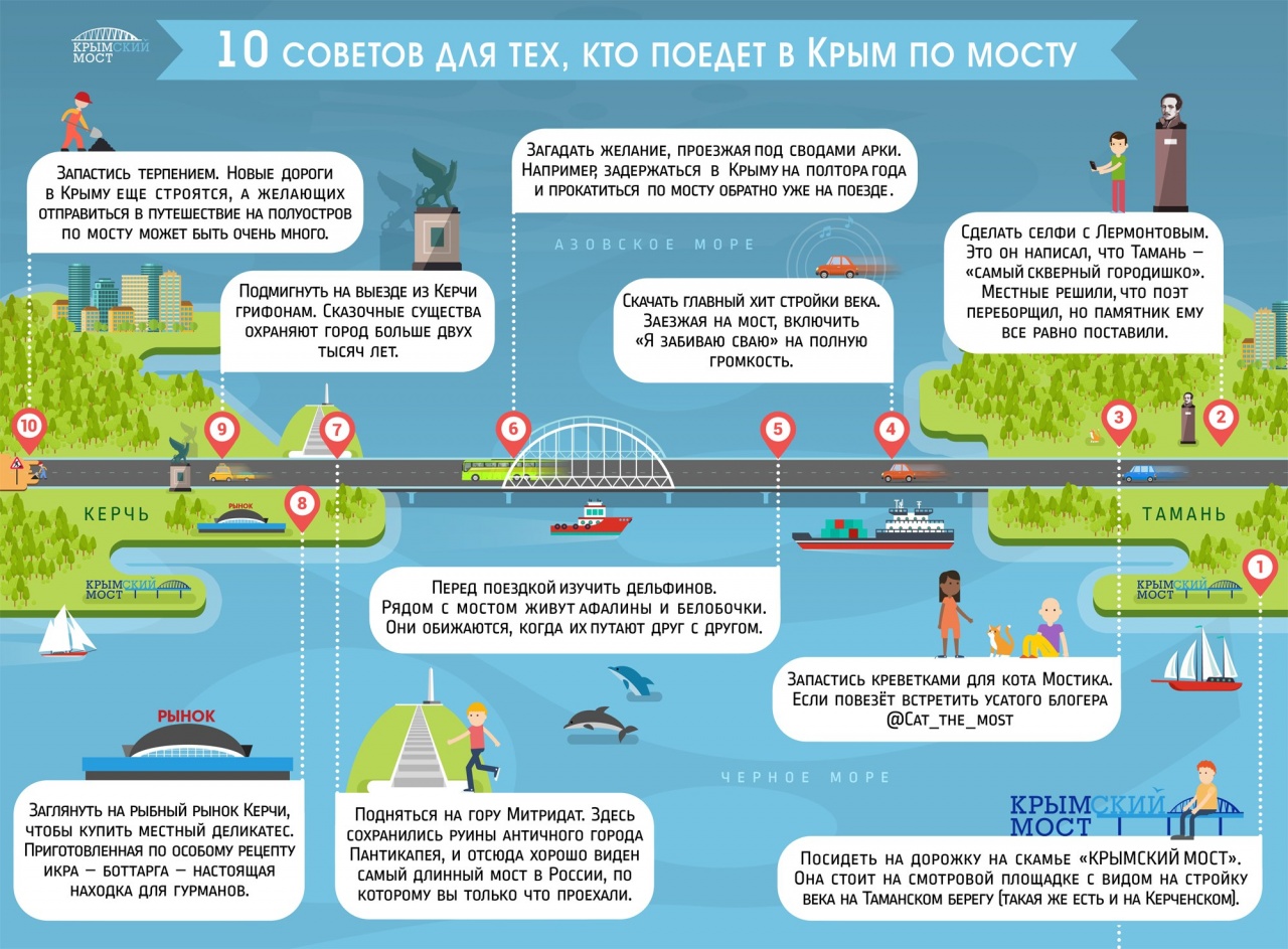 На официальной странице в соцсети Крымского моста появились рекомендации для тех, кто поедет в Крым по мосту. На инфографике изобразили 10 советов, - передает Керчь.ФМ.