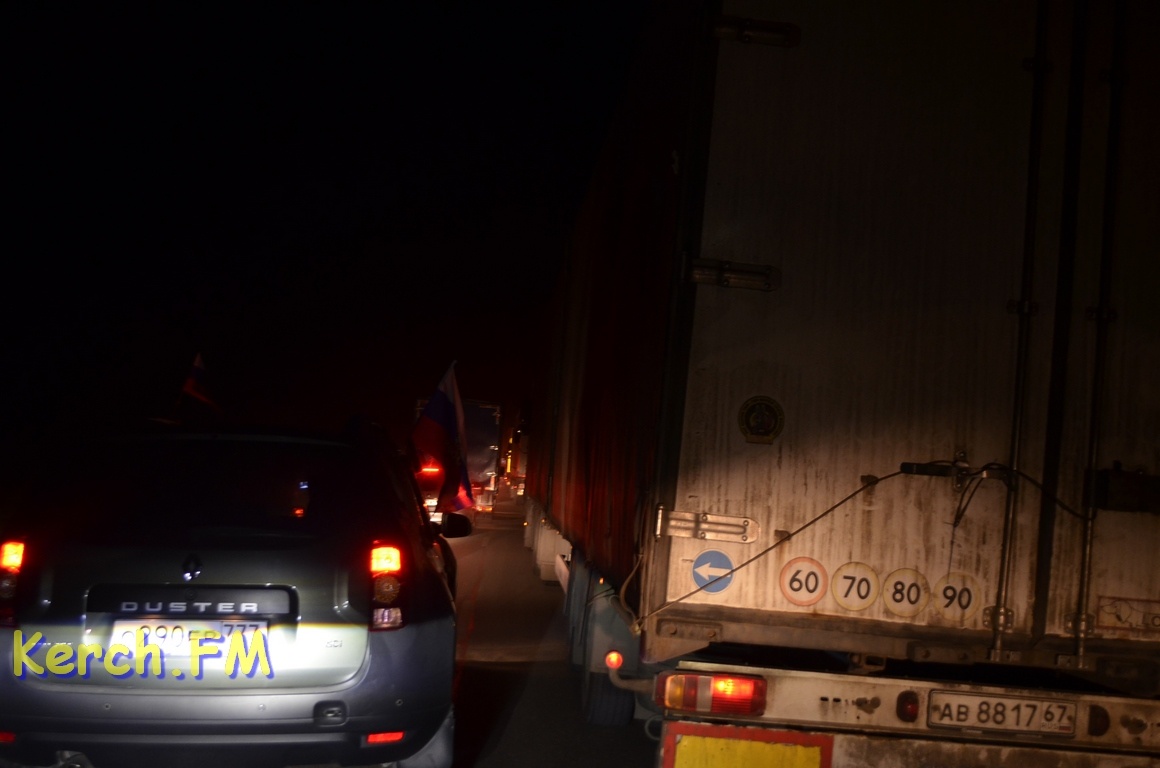 Однако, через два километра на выезде из города вдоль дороги на обочине стояла колонна грузовых машин. Водители устроили там свой отстойник. Тем самым, создали небольшое препятствие для «первооткрывателей» Крымского моста.