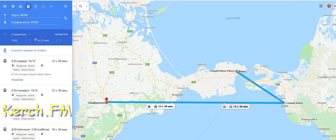 Из трех предложенных вариантов по средам, четвергам и пятницам, самый занимательный в пятницу. Этот вариант предлагает выехать из Керчи в пятницу в 8:05, а встречающим готовить караваи в Симферополе уже по субботам в 2:35. Вот это веселье, встреча с изюминкой, так сказать. Сие путешествие предлагает Гугл растянуть на 18 с половиной часов.
