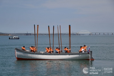 Молебен совершили во время прохождения катамарана под Крымским мостом, после чего судно направилось к Аршинцевской косе, где участники экспедиции встретились со студентами Керченского морского технологического университета на гребных лодках, «чтобы произошло братание» молодежи из разных регионов страны, говорит Татарков.