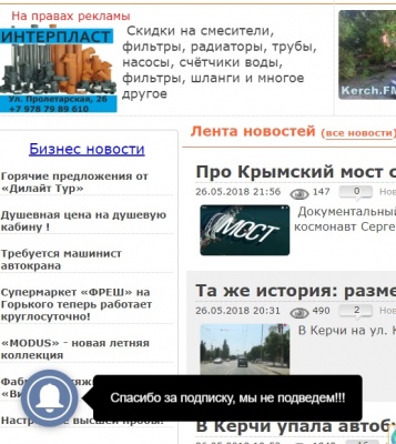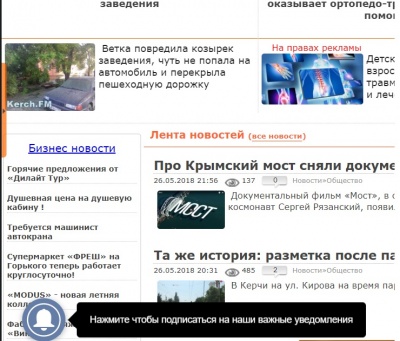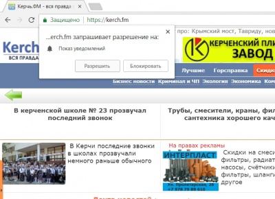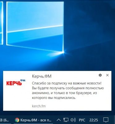 Дорогие наши читатели, команда Керчь.ФМ работает над улучшением вашей информированности. Для этого, мы внедрили на наш сайт возможность получать мгновенные уведомления о срочных и важных новостях. Из-за технических и законодательных ограничений наши уведомления будут приходить только в тот браузер, с которого вы подписались, и только если этот браузер у вас открыт в момент рассылки уведомлений.