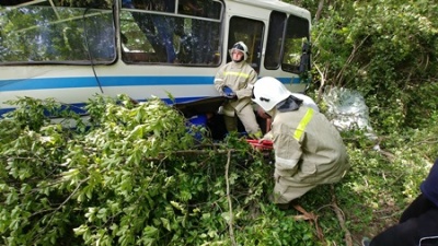 В Крыму 29 мая утром на автодороге «Грушевка-Судак» произошло дорожно-транспортное происшествие. Рейсовый автобус вылетел в кювет и перевернулся. На место выехали спасатели.