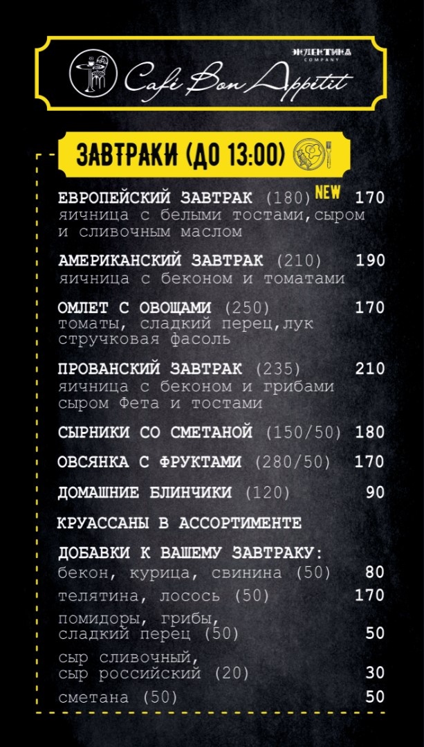 Предложение на завтраки актуально с 8:00 до 13:00 ежедневно. Ранний или поздник завтрак - для нас не имеет значения! Пусть Ваш день начинается аппетитно!