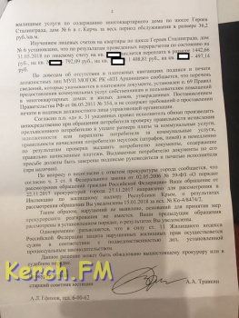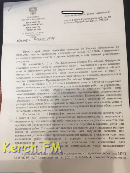 Керчане неоднократно обращались в прокуратуру. Последняя перенаправила одно из обращений в Жилинспекцию, по крайней мере такой ответ получили пенсионеры из прокуратуры. А в последнем ответе прокуратура дала ответ, что в случае, если керчане недовольны работой управляющей компании, то они вправе составлять соответствующие акты.