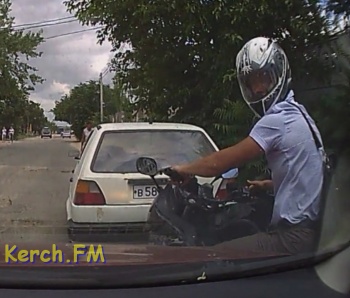 Вчера на таксопарке мопедист повредил автомобиль и уехал с места ДТП. Видео произошедшего прислал в редакцию Керчь.ФМ водитель легковушки.