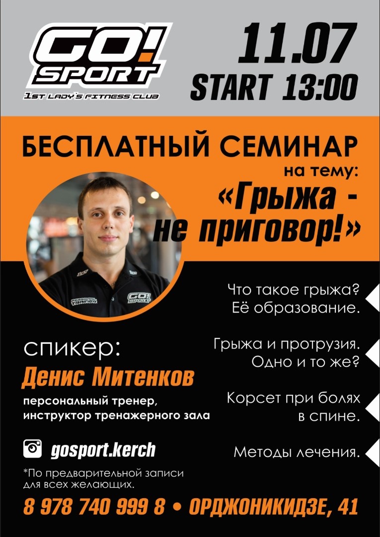 11-го июля в Go!Sport для всех желающий состоится бесплатный семинар от сотрудника клуба - Дениса Митенкова (квалифицированный персональный тренер, инструктор тренажерного зала и групповых направлений). Тема встречи: "Грыжа - не приговор!"