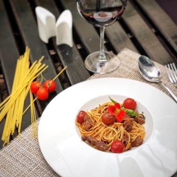 - спагетти с телячьей вырезкой и маринованными Черри собственного приготовления;
