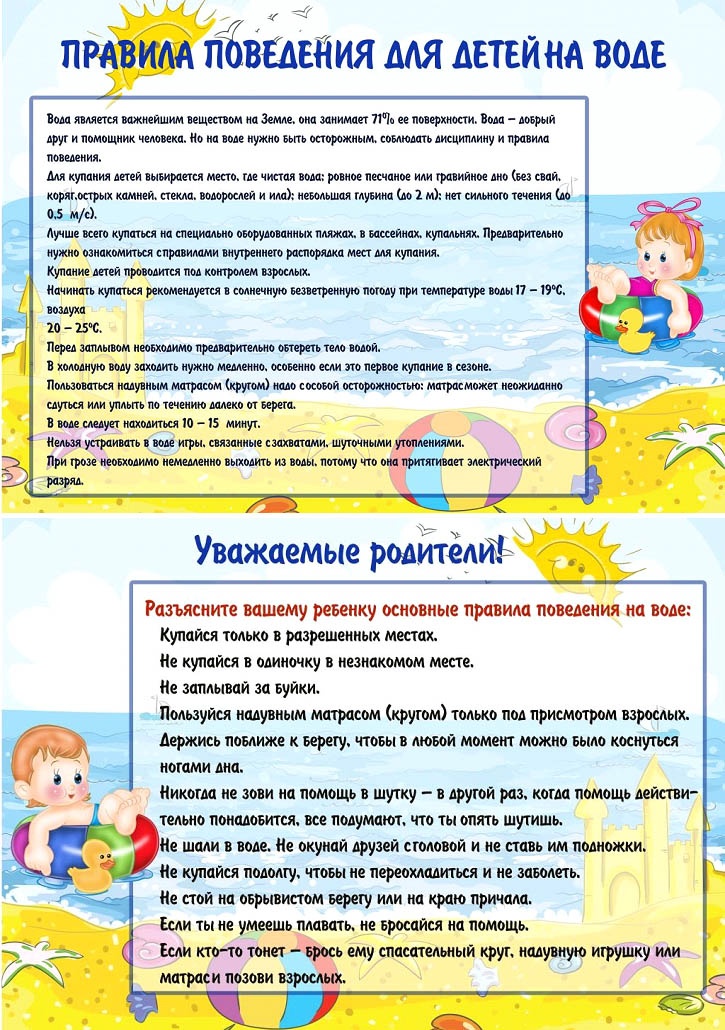 − нельзя, чтобы дети купались без присмотра, даже если они умеют плавать, очень важно при этом, чтобы присматривающий взрослый не находился в алкогольном опьянении;