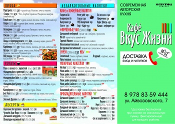 Доставка от кафе «Вкус Жизни» - это, в первую очередь, забота о Вашем свободном времени! Быстрый ритм жизни, загруженность на работе, домашние хлопоты все меньше оставляют нам шансы на драгоценный отдых. Не пренебрегайте возможностью побаловать себя свободной минуткой, провести время с родными, а в обеденный перерыв на работе порадовать себя полноценным обедом.