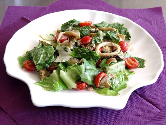 Салат "Дары моря" - микс из свежих морепродуктов (рапан, кальмар, мидия), салат Романо, томаты "Черри", соус "Ранч"