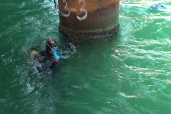 Демонтаж временных объектов в акватории выполняется совместно с водолазами. На протяжении трассы моста длиной 19 км работает несколько водолазных станций. Их сотрудники обследуют дно и поднимают на поверхность все металлические предметы. Сваи рабочих площадок, погруженные на разную глубину, извлекаются целиком или срезаются ниже линии размыва морского дна.