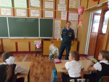 В День знаний учащимся напомнили о необходимости соблюдения основных правил безопасного поведения во время учебы, в быту и на природе. Так же были доведены детям элементарные правила осторожного обращения с огнем и обучили их умению правильно действовать в случае возникновения пожара. Особое внимание во время занятия уделено средствам индивидуальной защиты органов дыхания и первичным средствам пожаротушения. Дети с большим интересом слушали сотрудников МЧС, задавали интересующие их вопросы.