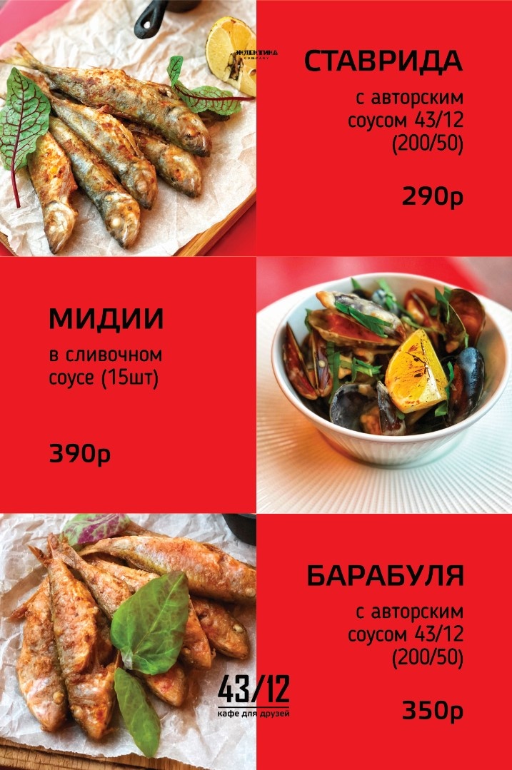 Для тех, кто верит в народную примету - «стол без рыбы в месяцы без буквы «р»» - пришла долгожданная пора. Барабулька, ставридка и отборная Черноморская мидия в специальном предложении от кафе 43/12. Предложение ограничено.