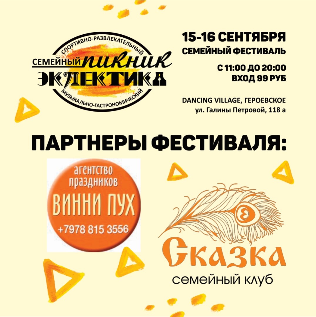 15-16 сентября состоится первый двухдневный семейный фестиваль на берегу Черного Моря от компании «Эклектика» (Героевское, пансионат Dancing Village, ул. Галины Петровой, 118 а)!