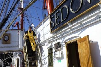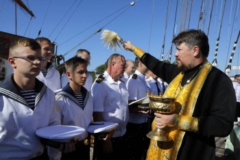 За сутки до выхода, утром 10-го сентября, на палубе барка провели молебен, в котором приняли участие капитан, руководители практики и курсантский состав.