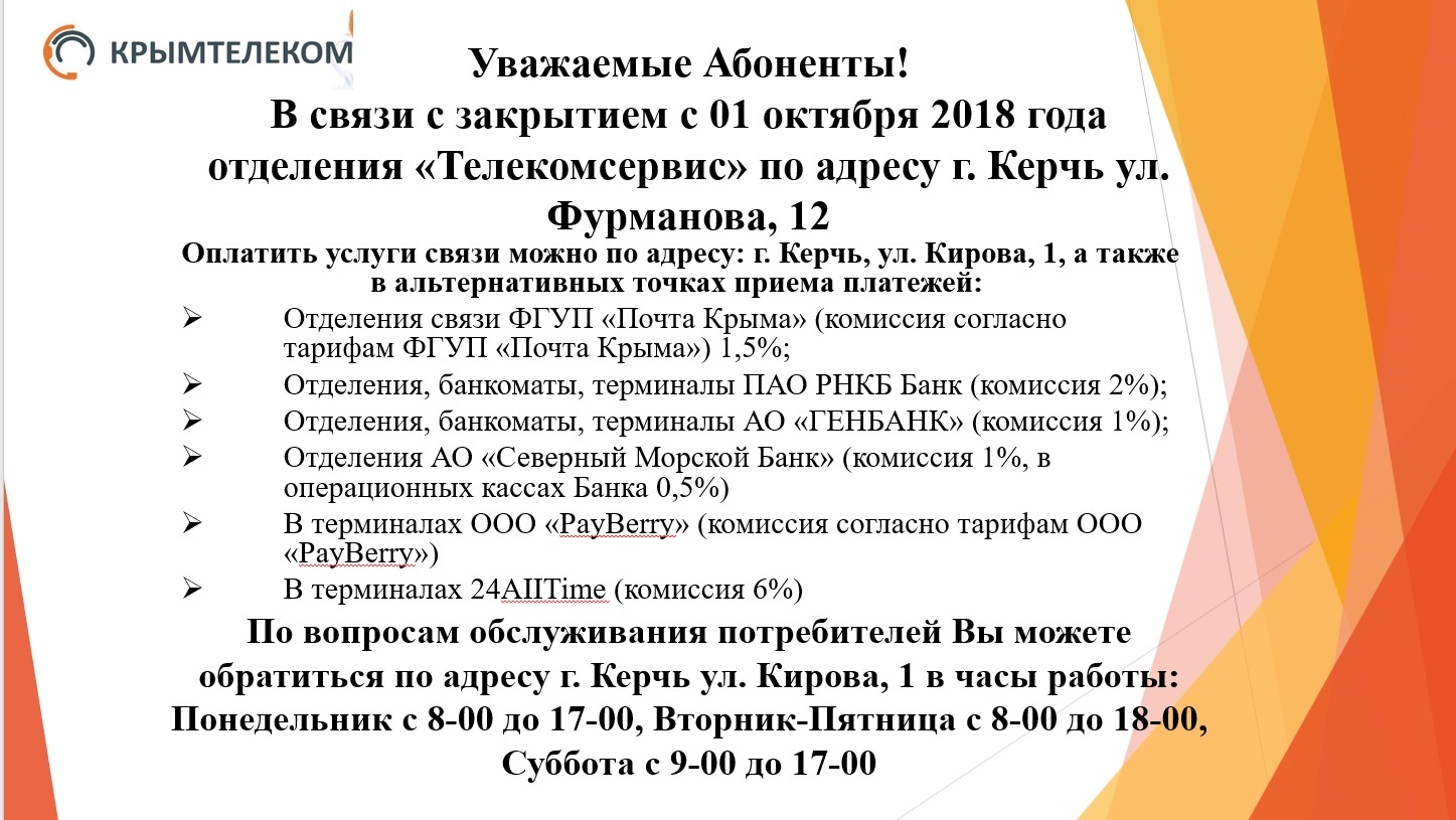 С 1 октября «Телекомсервис» закрывает свое отделение по Фурманова, 12. Об этом сообщила пресс-служба Крымтелекома, - передает Керчь.ФМ.