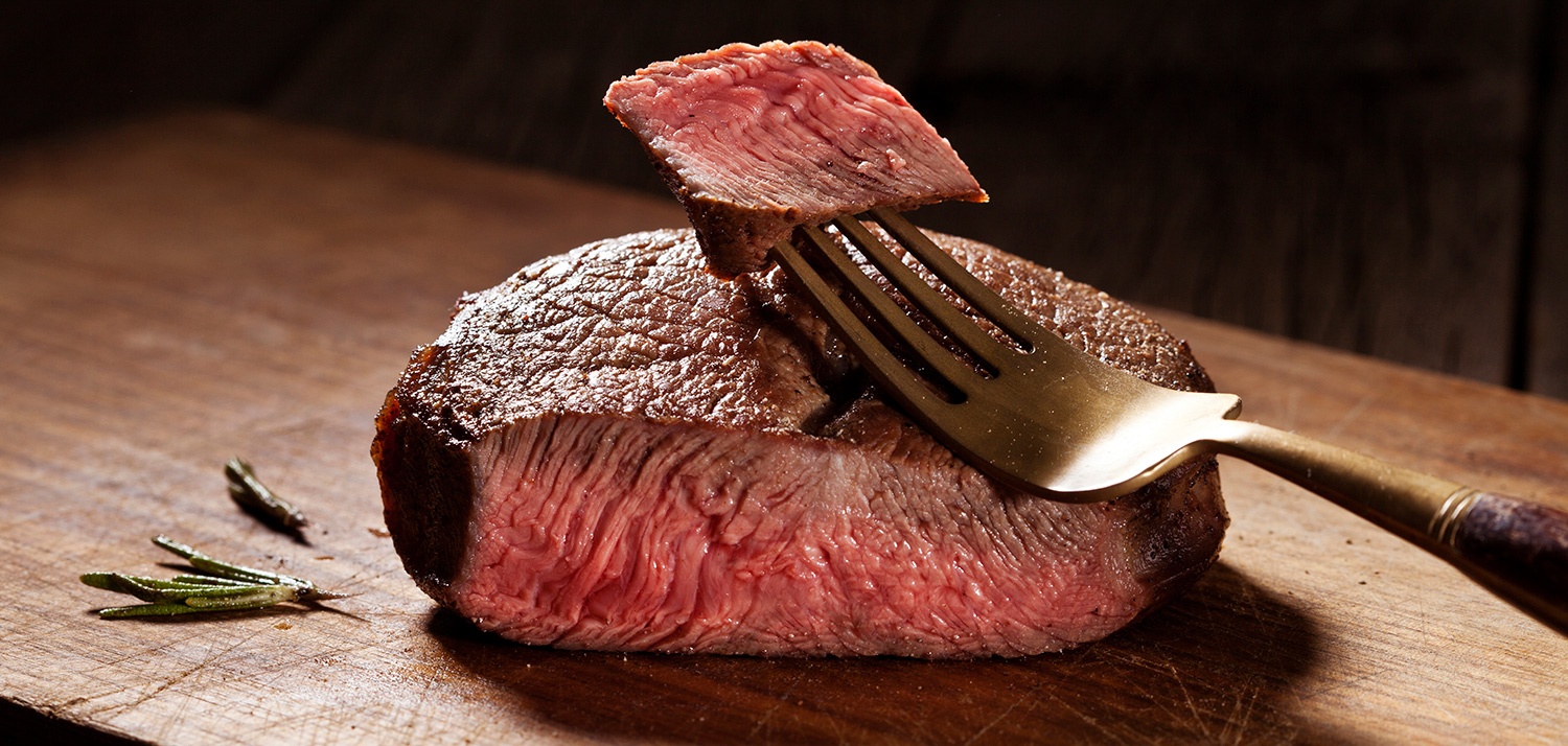 Стейк Шатобриан - поистине королевское блюдо. Его сочность и нежность не сравнима ни с одним другим видом премиальных стейков из говядины. Для стейка Шатобриан берется отруб головной части животного. В этой части мясной вырезки практически нет жировых вкраплений и соединительных тканей, поэтому при правильном приготовлении стейк получается нежнейшим и на 100 грамм содержит всего 267 кккал.