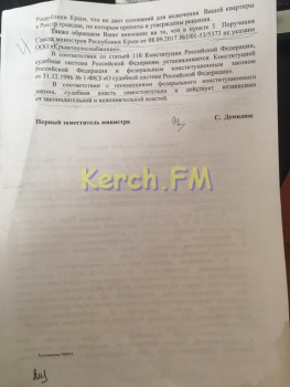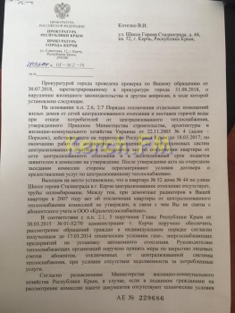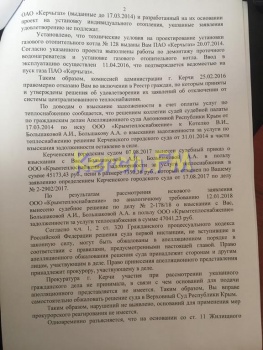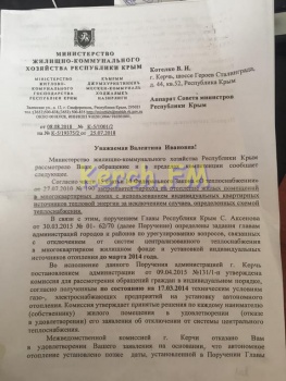 В сентябре 2017 года Совмин Крыма дал поручение главам администраций муниципальных образований о прекращении практики подачи исков в судебные органы ко всем абонентам ГУП РК "Крымтеплокоммунэнерго", ГУП РК "Вода Крыма", ГУП РК "Крымэнерго" за неоказанные услуги. Но и здесь инвалиду-керчанке не повезло - ООО "Крымтеплоснабжение" в указанном поручении не оказалось. МинЖКХ, прокуратура Керчи на письма инвалида отвечают отказом. Все ведомства ссылаются на то, что проект на установку газового оборудования был изготовлен после марта 2014 года, поэтому отказ комиссии во включении в Реестр граждан, по которым приняты и утверждены решения об отключении от центрального теплоснабжения, считают правомерным.