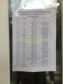 На двери висит список распределения групп для проведения занятий в учебном корпусе № 3 на 23 октября.