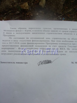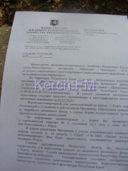 Чиновники с людьми не спорят, никто не отказывает в расселении. Более того, после собрания в администрации города 2017г., на котором помимо администрации города Керчь, присутствовал министр жилищного хозяйства РК, всех повели показать место, где запланирована стройка нового жилого дома и показали план дома в районе улицы Маяк, 15, где жители с Ремесленного, возможно, получат новое светлое жилье. Однако строительство так и не началось.