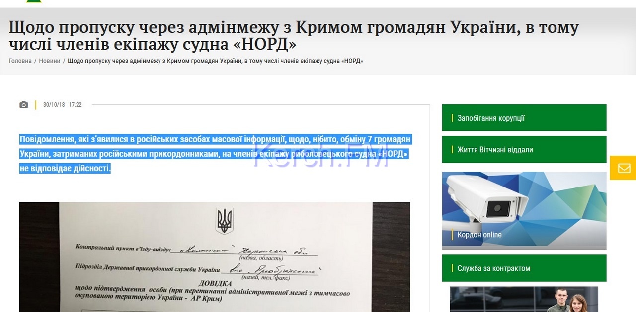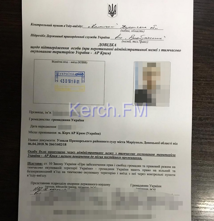 Пограничники сообщили, что сегодня, 30 октября, на КПП "Каланчак" (со стороны Украины, "Армянск", - со стороны Крыма, соответственно) прибыли члены экипажа "Норда". Ранее, украинскими судами при рассмотрении дел об админправонарушении были установлены принадлежности последних к гражданству Украины. Таким образом, все 7 членов экипажа, по утверждению ГПСУ, были оформлены на выезд в соответствии с действующим законодательством Украины. В подтверждение, ведомство опубликовало фотографию Справки с удаленными персональными данными, на которой видно, что сегодня гражданин Украины, проживающий в городе Керчь пересек границу.