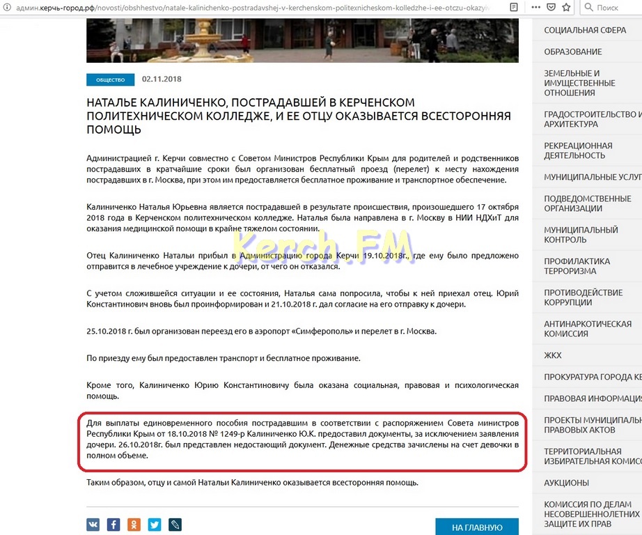В это же время глава администрации Керчи Сергей Бороздин через Фейсбук распространяет информацию пресс-службы администрации Керчи, где последние компетентно заявляют о том, что деньги перечислены на счет самой девочки.
