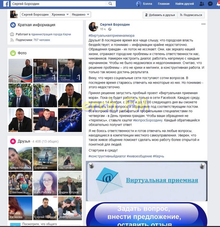 Принял решение запустить пробный проект «Виртуальная приемная мэра». Пока он будет работать только в сети Facebook. Каждую среду, начиная с 14 ноября, с 20.00 и до 12.00 следующего дня вы сможете размещать свои вопросы и обращения под соответствующим постом. Все вопросы будут разбираться профильными специалистами по четвергам - в День приема граждан. Чтобы ваши обращения не «терялись», ставьте хэштег #вопросБороздину. Каждый обратившийся обязательно получит ответ.