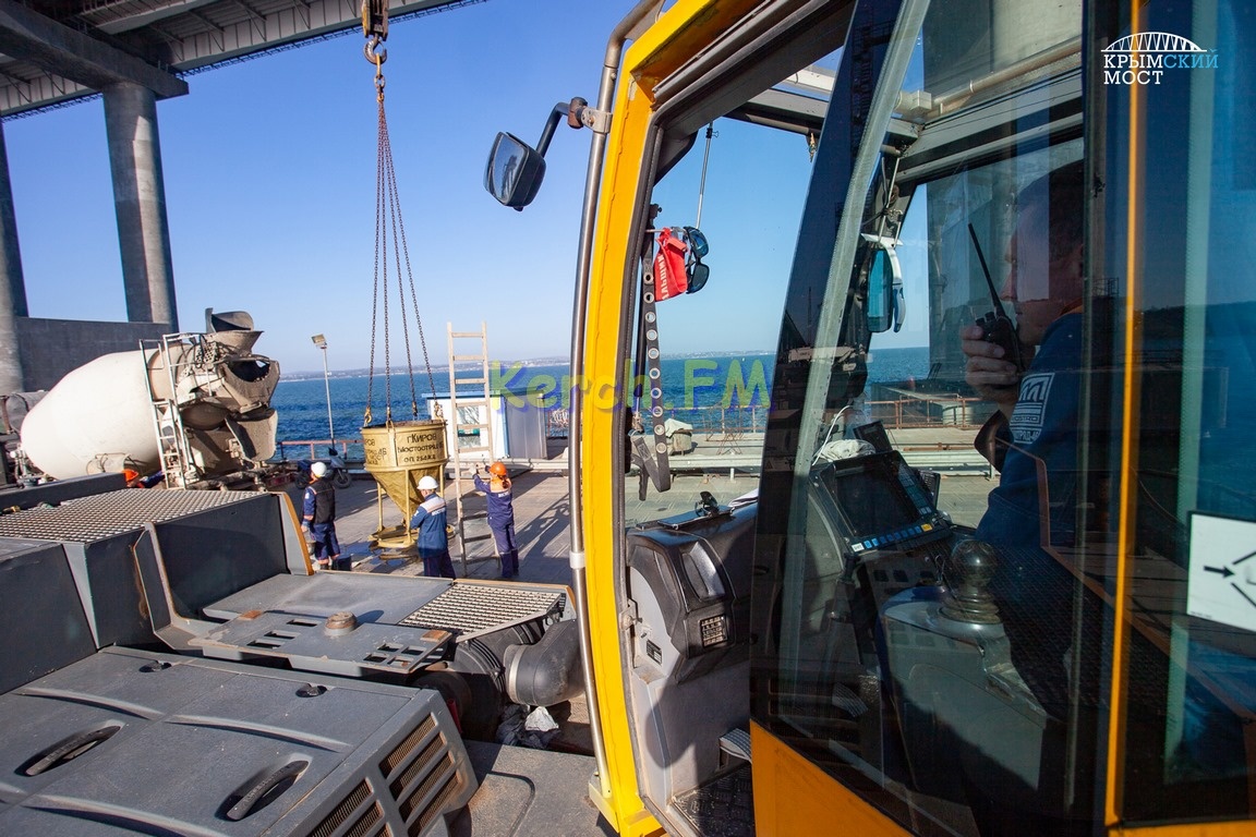 На готовых пролётах последовательно со стороны таманского берега формируется верхнее строение пути железной дороги. Уже уложено 9 из 38 км рельсошпальной решетки.
