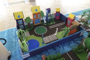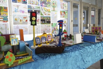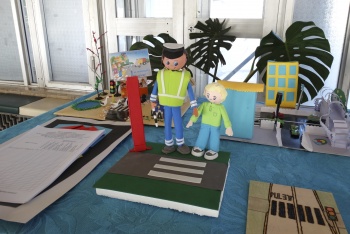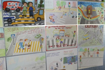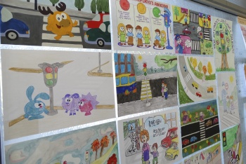 Сюжеты детских рисунков, плакатов, макетов, эмблем отражают опасные ситуации на проезжей части, изображение улиц города, различных видов транспорта, дорожных знаков, героев мультфильмов на дорогах.