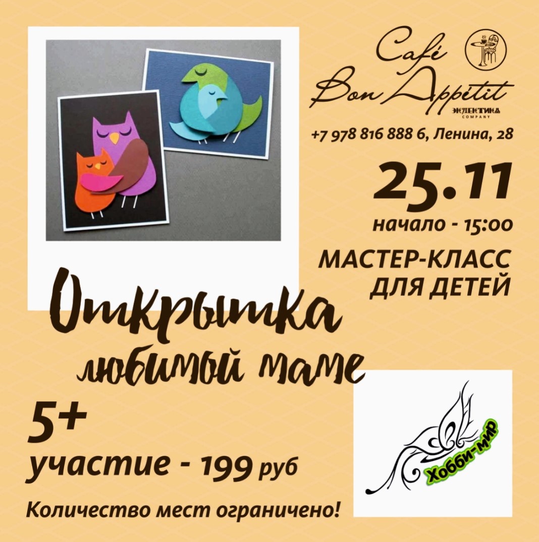 Воскресные мастер-классы по рукоделию для детей совместно с ведущими студиями и мастерами Керчи в кафе Bon Appetit. 25-го ноября (воскресенье) состоится мастер-класс от творческой студии "Хобби-мир", на котором ребята сделают трогательный подарок мамам в их праздник - поздравительную открытку в технике "аппликация".