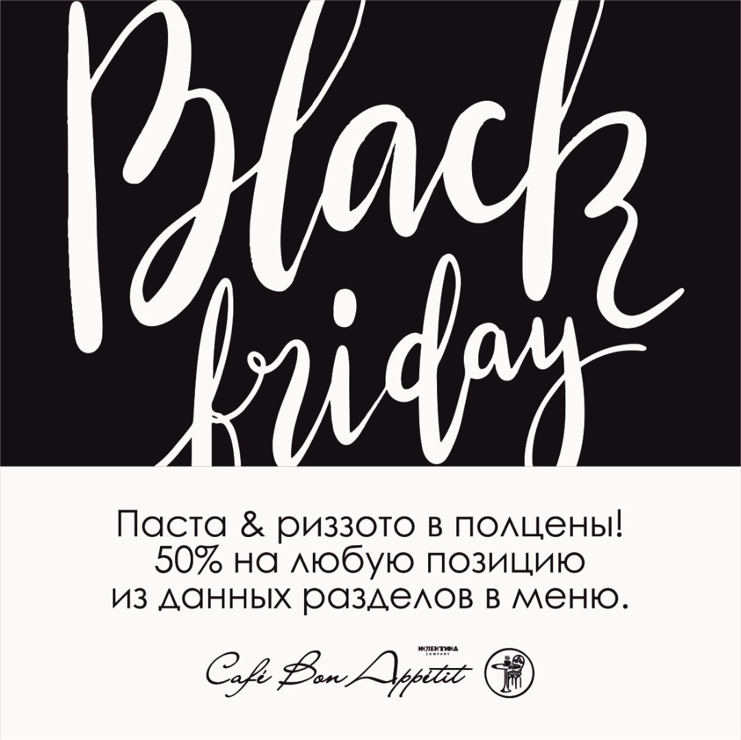 «Черная пятница» - настоящий праздник скидок, который не может не поддержать Bon Appetit. В пятницу всех гостей кафе в течение всего дня будет радовать специальное предложение - 50% на пасту и ризотто. Любая позиция из данных разделов меню в полцены. Хотим напомнить, что с 20:00 каждую пятницу и субботу для Вас играет лаундж-пианист - Анна Железняк. Незабываемой Вам «черной пятницы» 2018!