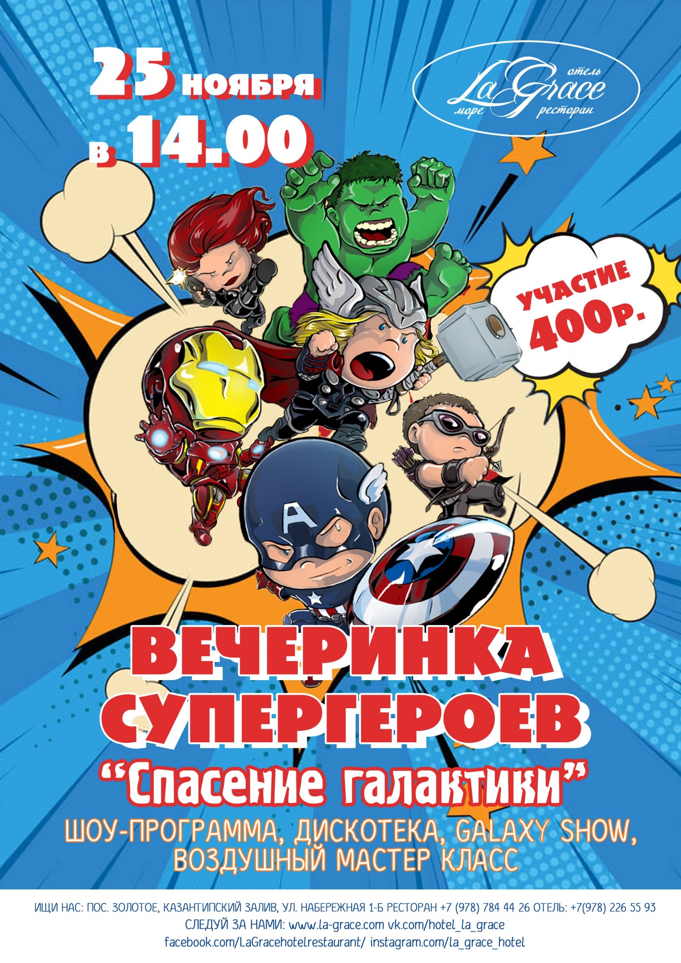 Яркая шоу-программа, зажигательная дискотека, Galaxy Show, а так же увлекательный воздушный мастер-класс, все это ждет наших юных спасателей на вечеринке супергероев «Спасение галактики» уже в это воскресенье, вместе с нашими друзьями из детского игрового центра «Мультляндия».