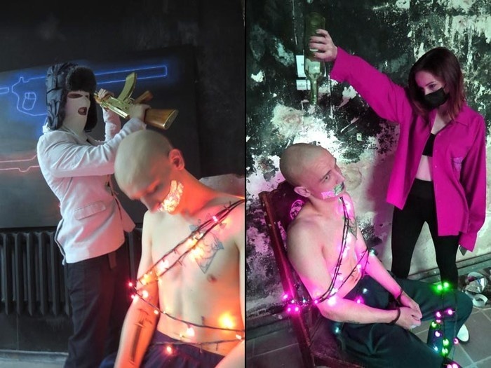 Она поведала мне о том, что в музей постучались серьезные дяденьки в пиджаках с жалобами на мою работу "Новогоднее чудо". Сие творение являет собой инсталляцию, состоящую из бедолаги с заклеенным ртом, он закован в наручники, обмотан гирляндами. Его надзиратель - вооруженный, клюквенно одетый засранец. Рядом стоят 3 пустых бутылки из-под горячительного. И я думал, что концепция проста, как 3 рубля, легковесна и не требует пояснений. Но не все так просто. В работе углядели экстремизм, призыв к насилию, терроризму, неуместное использование оружия в экспозиции на фоне событий в Керчи. Я не преувеличиваю, как всеми известный ловец покемонов, которому не приписывали терроризм, а также, в отличие от него, из моих уст не звучали прямые оскорбления в адрес конфессий и прочих социальных групп. Директор музея разъяснила недобрым дяденькам концепцию, однако предупредила, что за мной могут приехать и вежливо побеседовать, дала инструкции о том, что делать в этом случае, за что ей отдельное спасибо» пишет Черноок в соцсетях.