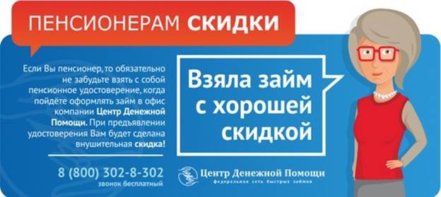Если Вы пенсионер, то не забудьте взять с собой пенсионное удостоверение, когда пойдёте оформлять займ в офис компании Центр Денежной Помощи. При предъявлении удостоверения Вам будет сделана внушительная скидка!