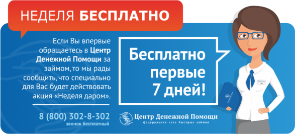 Если Вы впервые обращаетесь в Центр Денежной Помощи за займом, то мы рады сообщить, что специально для Вас будет действовать акция «Неделя даром».