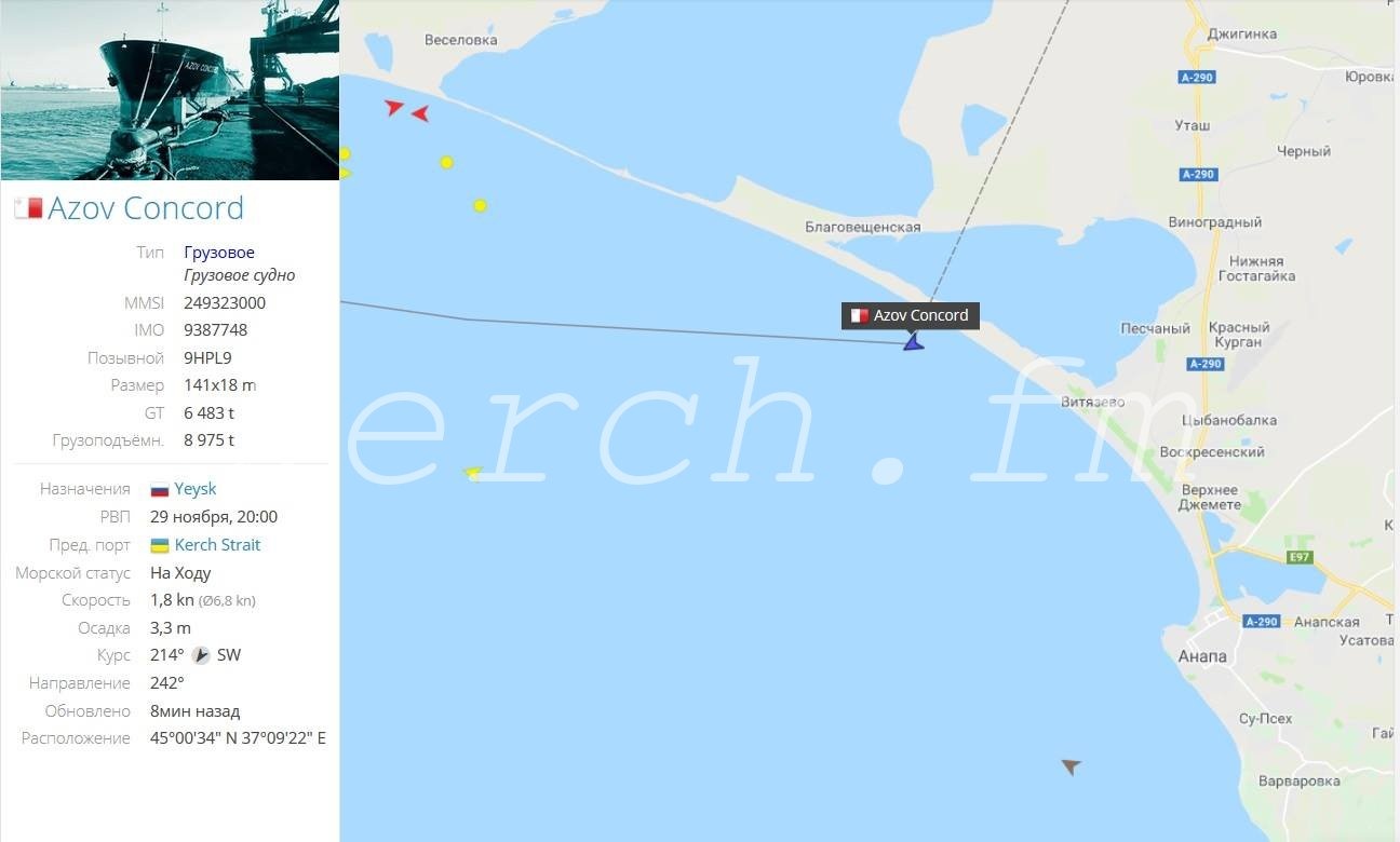 Местоположение "Azov Concord" на 10 часов утра 1 декабря 2018 года