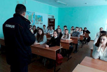 Полицейский вместе со старшеклассниками рассмотрели методы агитации молодежи в свои ряды представителями запрещенных организаций, а также формы противодействия данной противоправной деятельности.