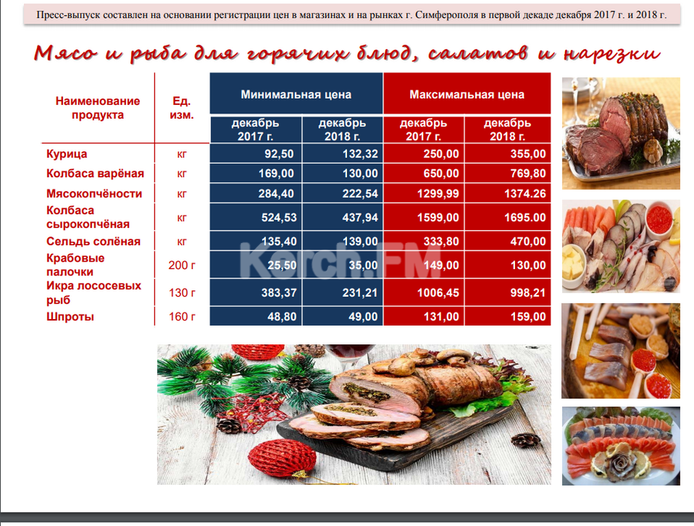 Минимальная стоимость набора продовольственных товаров для новогоднего стола в декабре 2018 года составила 3524, 41 руб. в расчете на семью из четырех человек. Это на 11% ниже, чем в декабре 2017 года. В прошлом году, по информации ведомства, минимальный новогодний стол обходился крымчанам в 3951, 07.