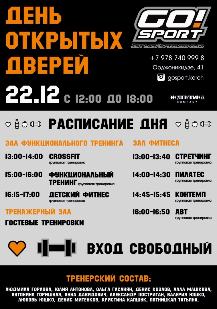 22.12.2018, в субботу, в фитнес-клубе GO!Sport снова пройдет ДЕНЬ ОТКРЫТЫХ ДВЕРЕЙ!