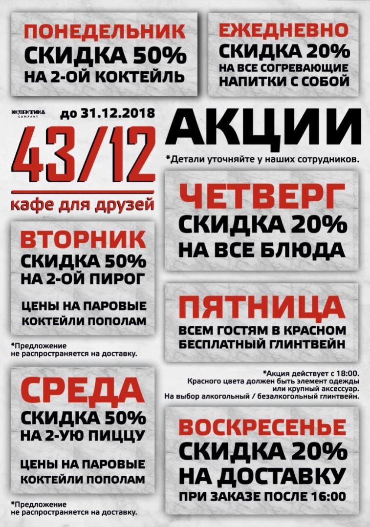 Меню кафе 43/12: https://vk.com/album-159822648_250557295https://vk.com/album-159822648_250557295.