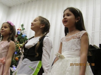 Яркими новогодними звёздочками сверкали на сцене ансамбли юных исполнителей - вокальные ансамбли «Каприс» и «Дебют» (рук. Чепурных И.П.), вокальный квартет учениц 2-го класса (преп. Конюкова Н.М.), ансамбль гитаристов (рук. Кизимов Ю.В.) и Образцовый хоровой коллектив «Кампанелла» (рук. Грибова Т.Л.). Образно и эмоционально выступали маленькие солисты-вокалисты, тепло приняла публика выступление юных гитаристов (преп. Мягкоголовый А.Д.) и баяниста (преп. Куртмеметов Э.Р.).