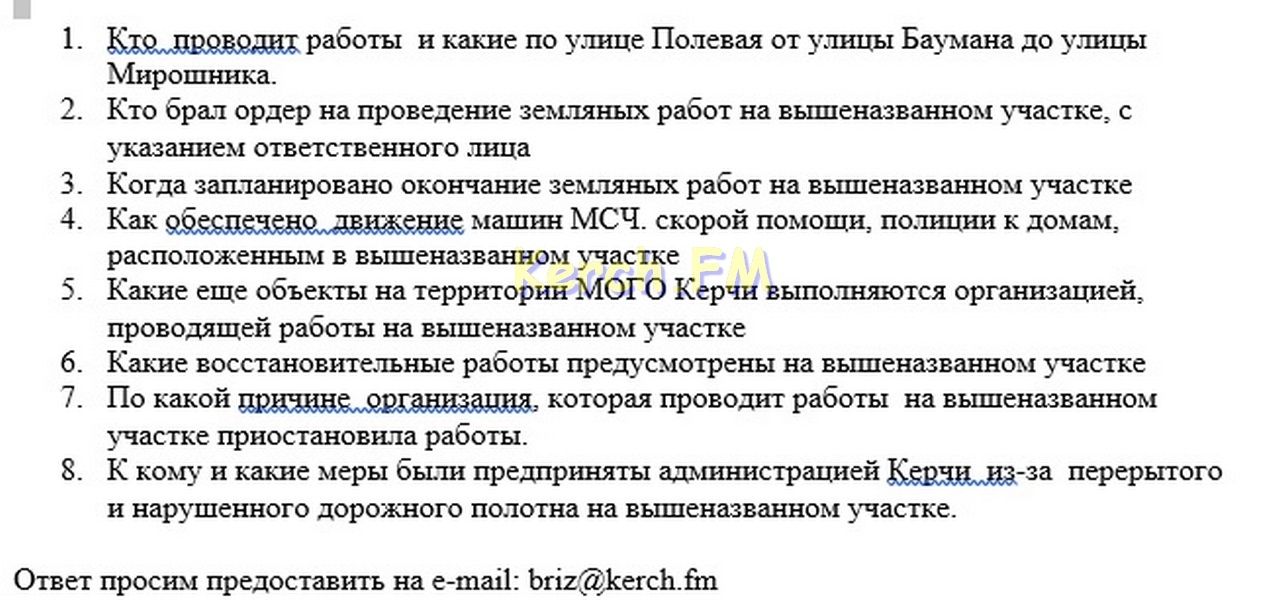 Если быть точным, то вопрос был задан следующим образом: «Кто и какие проводит работы по улице Полевая - от улицы Баумана до улицы Мирошника».