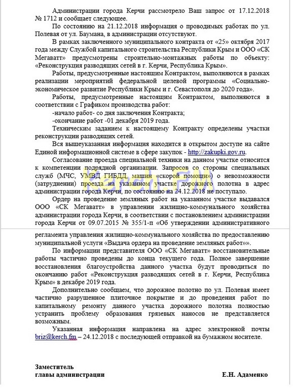 По состоянию на 21.12.2018 информация о проводимых работах по ул. Полевая от ул. Баумана, в администрации отсутствуют. Такой ответ дала администрация на информзапрос редакции Керчь.ФМ о состоянии улицы Полевая в Керчи.
