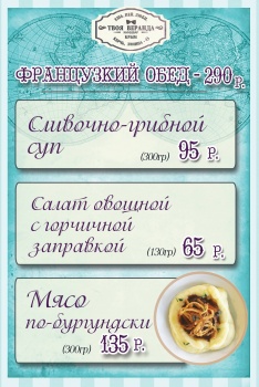 Французский обед: нежный сливочно-грибной суп, салат овощной с медово-горчичной заправкой и мясо по-бургундски с хрустящими луковыми кольцами - 290 р.