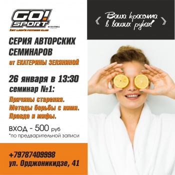 26-го января в GO!Sport стартует серия авторских семинаров от Екатерины Зеляниной: «Красота в ваших руках!». Екатерина изучает темы естественного сохранения молодости, здоровья и красоты; любит путешествовать и готовить вкусную полезную еду.