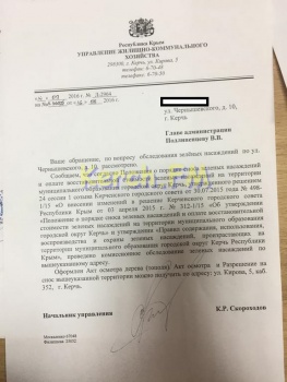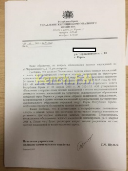 Курирующий ЖКХ Керчи замглавы администрации Евгений Адаменко сообщил, что в этом году впервые были заложены в городской бюджет средства на спил аварийных деревьев. Адаменко обещал внести дерево, которое несет угрозу безопасности по улице Чернышевского, 10 в перечень деревьев под спил.