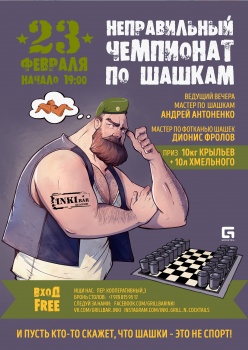 В честь праздника «Дня защитника Отечества» Гриль-бар INKI проведёт огненный чемпионат по шашкам. Но это еще не всё, самый стойкий, азартный и крепко стоящий на ногах игрок - получит в ПОДАРОК 10 килограмм крыльев + 10 литров хмельного!