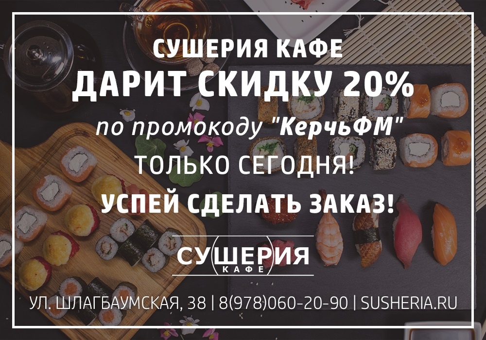 Успейте воспользоваться выгодным предложением сейчас! При заказе скажите оператору промокод «КерчьФМ» и получите скидку 20%! Сделать заказ можно через сайт: https://susheria.ru/