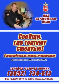 В Крыму стартовал первый этап антинаркотической акции «Сообщи, где торгуют смертью!», направленной на вовлечение широкой общественности в профилактику наркомании и борьбу с незаконным оборотом наркотиков. Об этом сообщает МВД Крыма, - передает Керчь.ФМ.